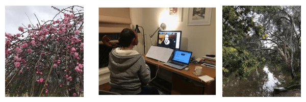 ‘My study’s function has expanded in this COVID-19 world to include Squawkestra rehearsal space, mask-sewing facility and working from home office. I’m grateful to have such a place to maintain social connections, make music and continue working but it’s the escape of my daily walk that allows me to spend the rest of the day there. Seeing the wattle bloom on the banks of the Yarra, noticing the emerging blossoms in neighbours’ gardens and hearing the currawongs and magpies carolling or the lorikeets’ tuneless screeches re-energises me for another day in my study’. (Katherine Ramsay)