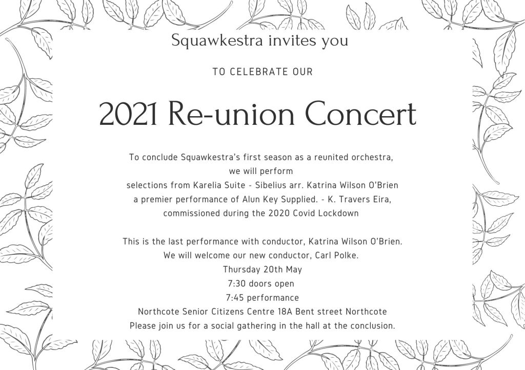 Squawkestra’s “Re-unite” Season concludes with a “Re-union” Concert where we will say “Farewell” to our current conductor, Katrina Wilson O’Brien and “Welcome” to our new conductor Carl Polke.
